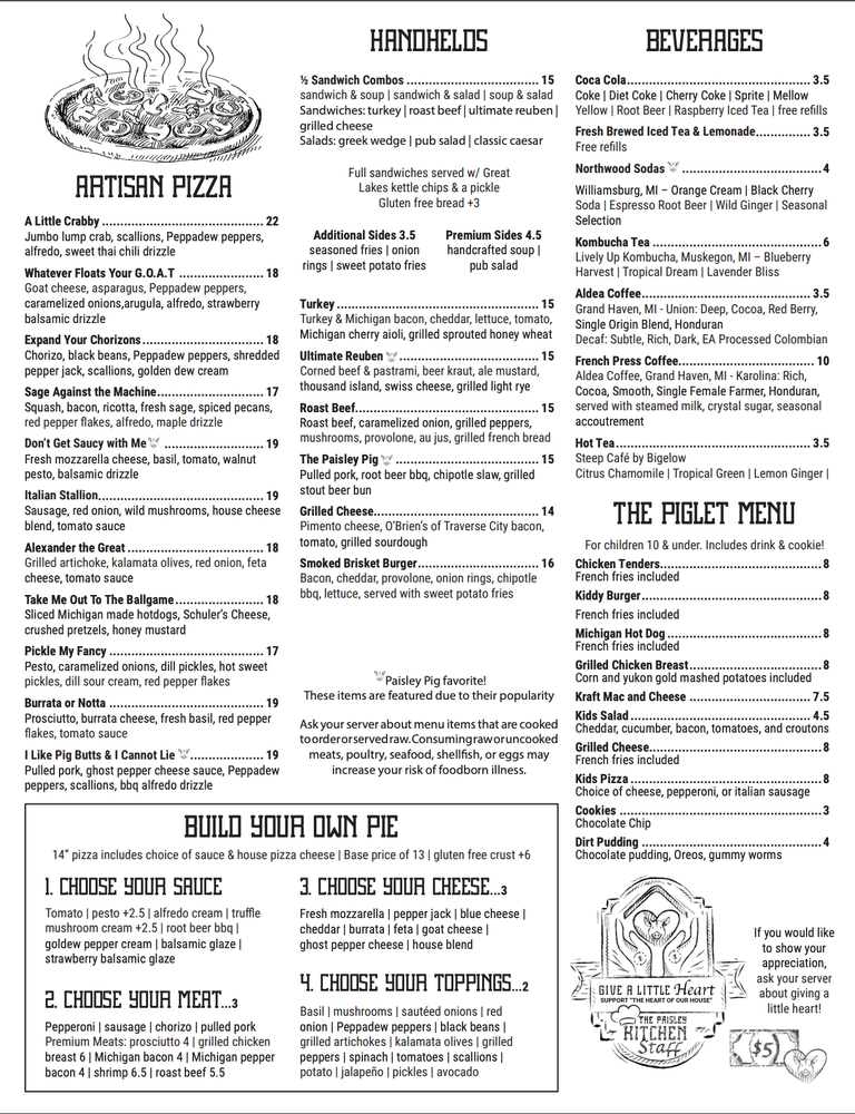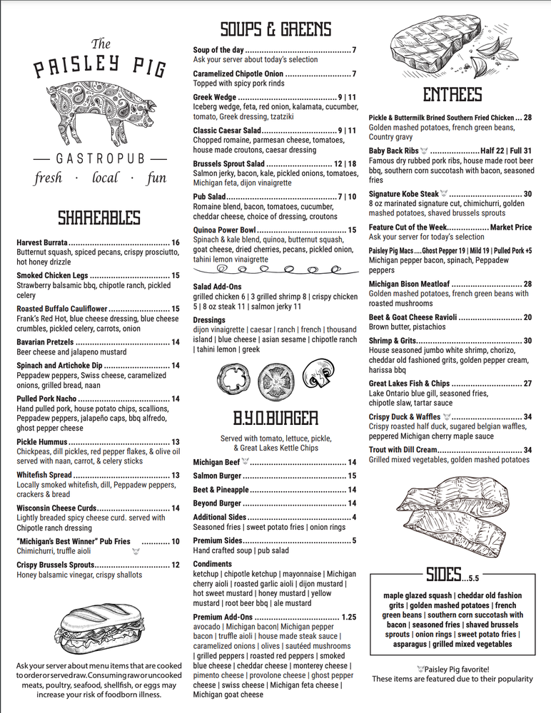 The Paisley Pig Gastropub located in Grand Haven, MI offers a diverse menu with options for everyone, including vegan and vegetarian choices. The casual and trendy atmosphere, along with amenities like outdoor seating, full bar, and free Wi-Fi, make it a great spot for lunch or dinner. Customers rave about the delicious food, from brisket meatloaf and baby back ribs to unique dishes like crab ragoon pizza and whatever floats your GOAT pizza. The friendly staff and fast service enhance the overall dining experience. With positive reviews praising the food quality, creative menu options, and accommodating service, The Paisley Pig Gastropub is a must-visit for those looking for a memorable dining experience.